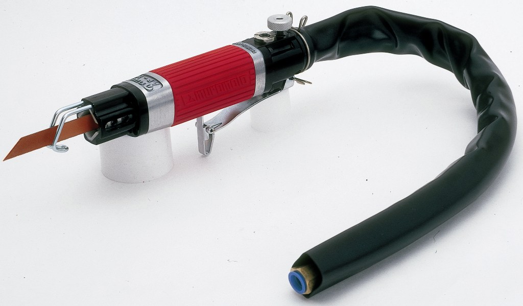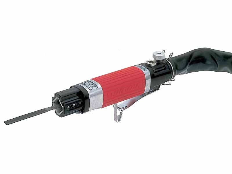 Pneumatic saw & file.Cutting metal plates with saw blade.